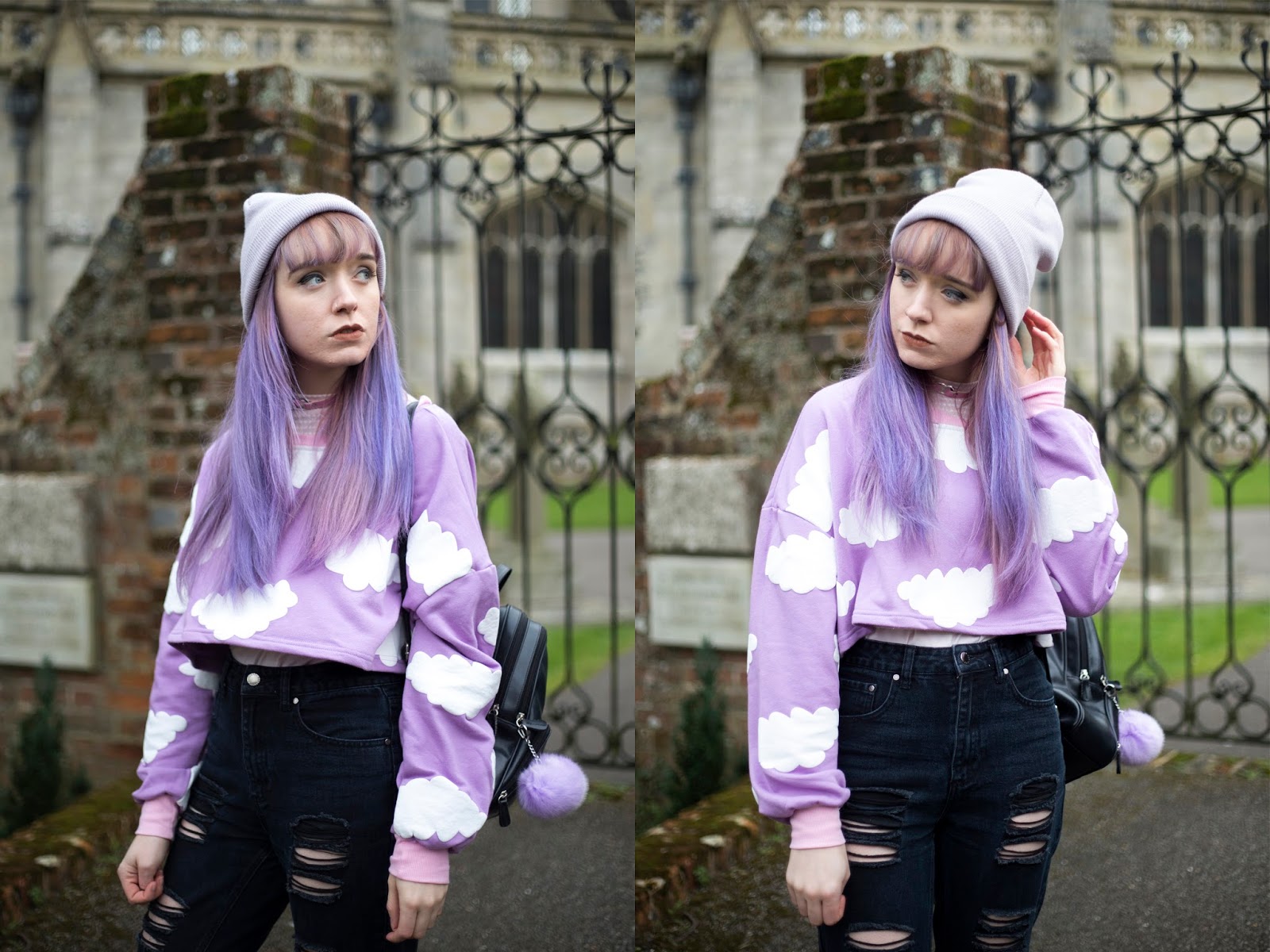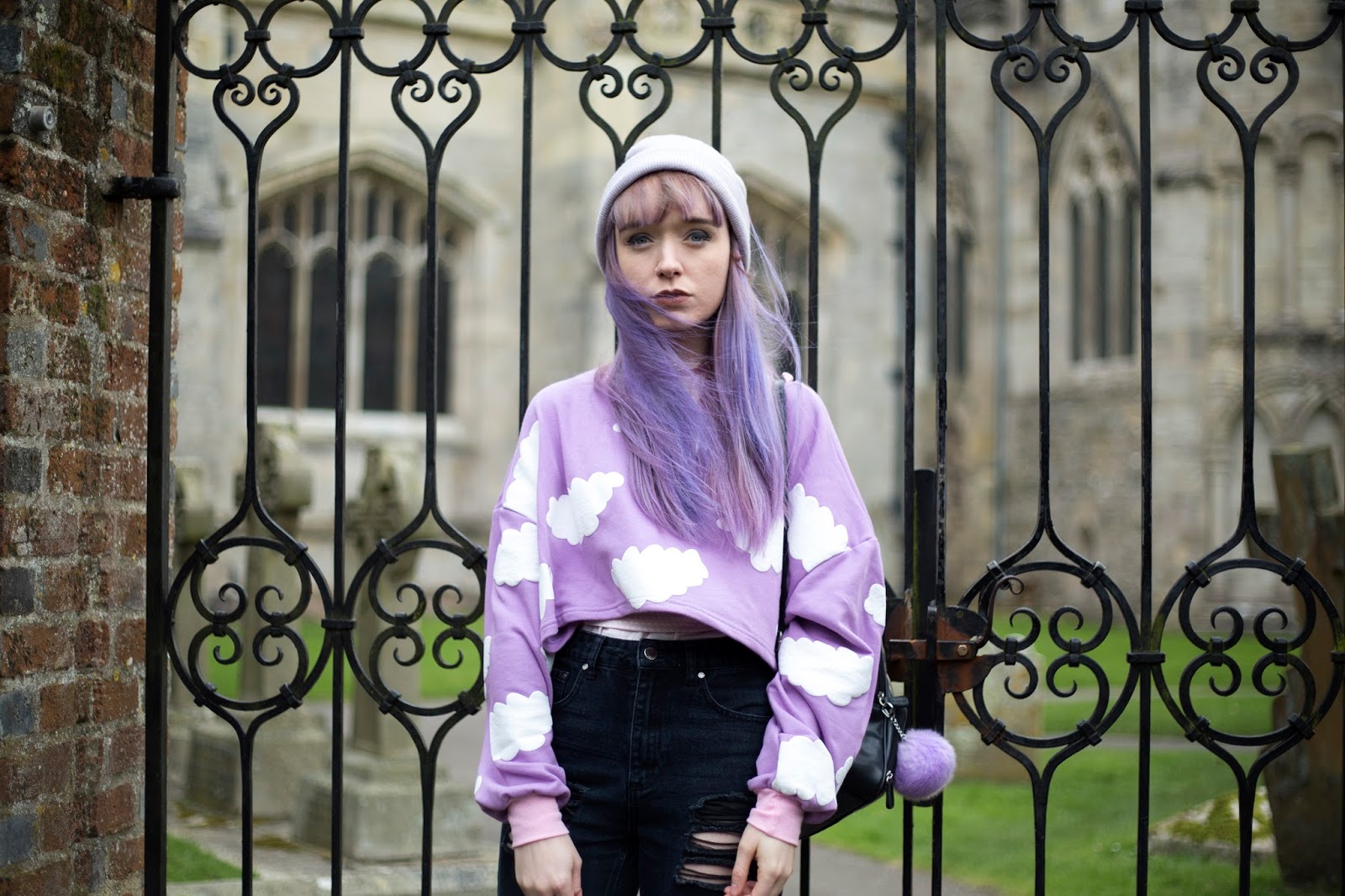 This jumper feels like I’m channeling my inner “Kawaii-self” thanks to its lilac shade and Japanese cartoon inspired cloud print. In fact a lovely friend gave me hers after receiving two by mistake in a recent OASAP order. I just love how girly it is and how the jumper injects a shade of pastel colour to my outfit, which is normally along the lines of all black/”gothic”. For todays I look I wanted to add a harsh contrast to the jumper, both colour and fabric wise, with that in mind I opted for a pair of my ripped high waisted Mom Jeans from Boohoo to pair with the jumper. Keeping along the “harsh contrast” feel I also paired the jeans with a pair of my beloved Dr. Martens which I think I have managed to *finally* break in. For those of you who have ever owned a pair of DM’s know exactly what I mean when I say that your feet will have to suffer for a couple of months before the pleasure of wearing them kicks in…Needless to say I’ve binned the plasters and embracing the DM’s.